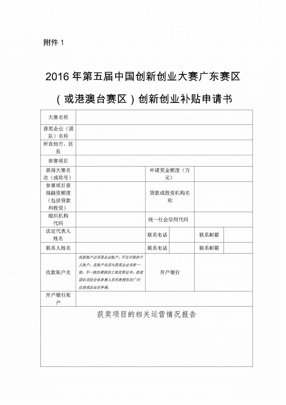 各有关单位: 根据《广东省科学技术厅关于组织申报2017年度省科技发展专项资金项目(第四批)的通知》(穗科函规财字〔2017〕350号),对2016年中国创新创业大赛广东赛区、港澳台赛的优胜企业和团队(须落户广东省内)予以创新创业补贴,由所在地市科技部门核实并发放补助,2016年创新创业大赛广东赛区暨港澳台赛组织单位予以配合。现就有关事项通知如下: 一、补助对象 (一)2016年中国创新创业大赛广东赛区的优胜企业和团队; (二)2016年中国创新创业大赛港澳台赛优胜企业和团队; 2016年第五届中国创新创业大赛广东赛区、港澳台赛优胜团队须分别于2017年3月31日和2017年12月31日前在广东省内注册成立企业。 二、支持方式、强度 (一)对获得2016年第五届中国创新创业大赛广东赛区一等奖、二等奖、三等奖、优胜奖的参赛企业,以后补助的方式分别给予40万元、30万元、20万元、10万元的创新创业补贴,最多240家。对获得2016年第五届中国创新创业大赛广东赛区一等奖、二等奖、三等奖、优胜奖的团队,以后补助的方式分别给予20万元、10万元、6万元、4万元的创新创业补贴,不超过60个。 (二)对获得2016年第五届中国创新创业大赛港澳台赛一等奖、二等奖、三等奖、优胜奖的参赛企业,以后补助的方式分别给予20万元、15万元、10万元、5万元的创新创业补贴,最多20家。对获得2016年第五届中国创新创业大赛港澳台赛一等奖、二等奖、三等奖、优胜奖的团队,以后补助的方式分别给予10万元、5万元、3万元、2万元的创新创业补贴,不超过25个。 三、须提交的资料 1. 2016年第五届中国创新创业大赛广东赛区(或港澳台赛区)创新创业补贴申请表(附件1); 2. 企业营业执照; 3. 组织机构代码证; 4. 税务登记证书; 5. 获奖证明文件资料; 6. 用款申请信息表(附件3)。 7. 团队成员授权成立企业承诺书(获奖团队须提供,模板见附件2); (以上材料须加盖单位公章,一式一份报送至大赛组织单位,并发送电子版(用款申请信息表发送Excel格式)至指定邮箱)。 四、资料受理 (一)广东赛区大赛组织单位。 地 址:广州市海珠区广州大道南1601-1603号洋湾岛020创新实验室106室 联 系 人:宣琦琦、金若谷,18127975859、13533168232 电子材料受理邮箱:18127975859@163.com (二)港澳台赛大赛组织单位。 地 址:广州市番禺区大学城外环西路100号广东工业大学理学馆309 联 系 人:刘璐雅,020-3938008 电子材料受理邮箱:hpguo@gz-cxjy.com (三)受理时间。 纸质材料受理截止时间:2017年7月30日。 (四)其它。 2017年7月30日之后才注册成立企业的港澳台赛优胜团队,相关资料直接报送至市科技创新委科技金融处。 地 址:广州市越秀区连新路45号910室 联 系 人:罗成,83124142 电子材料受理邮箱:307942165@163.com 请大赛组织单位将相关资料审核汇总,于2017年8月10日前提交至市科技创新委。 附件:1.2016年第五届中国创新创业大赛广东赛区(或港澳台赛区)创新创业补贴申请书.doc