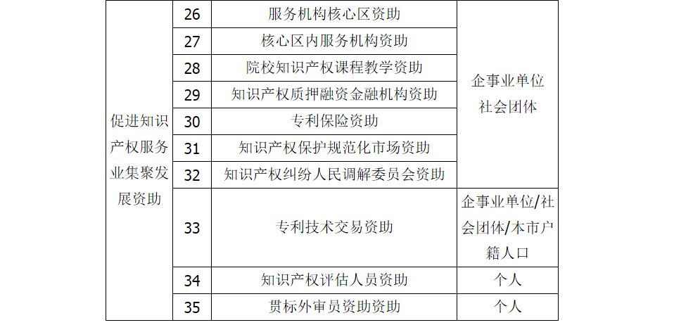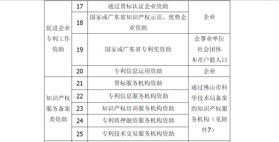 各区经济和科技促进局,各有关单位: 根据《佛山市人民政府办公室关于印发佛山市专利资助办法的通知》(佛府办〔2013〕14号)、《佛山市人民政府办公室关于印发佛山市专利资助办法补充规定的通知》(佛府办〔2014〕44号)和《佛山市人民政府办公室关于印发佛山市促进知识产权服务业集聚发展资助试行办法的通知》(佛府办〔2016〕12号),现就开展2016年度专利资助申报工作有关事项通知如下: 一、资助类别和对象 资助包括对发明专利资助、专利维权资助、促进企业专利工作资助、知识产权服务备案类资助、促进知识产权服务业集聚发展资助共五大类专利创造、保护、运用、管理和服务行为的资助,详见下表:
