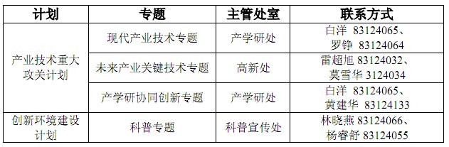 (四)综合业务咨询。 市科技创新委发展规划处。联系人:吴玲、何青霞,电话:83124035、83124038。 (五)党风廉政举报。 市纪委派驻纪检组。电话:83722183。 (以上电话接听时间为:工作日8:30-12:00、14:00-17:30) 附件:1.各科技计划项目申报指南(附件1-1至1-4) 1-1.广州市产业技术重大攻关计划现代产业技术专题申报指南.pdf 1-2.广州市产业技术重大攻关计划未来产业关键技术专题申报指南.pdf 1-3.广州市产业技术重大攻关计划产学研协同创新专题申报指南.pdf 1-4.2018年广州市科普专项重点项目申报指南.pdf 2.项目经费预算编制要求.pdf 3.广州市科技业务管理阳光政务平台操作指南.pdf 4.广州市科技创新发展专项资金项目部分立项权下放试点方案.pdf 5.各区科技主管部门联系方式.pdf