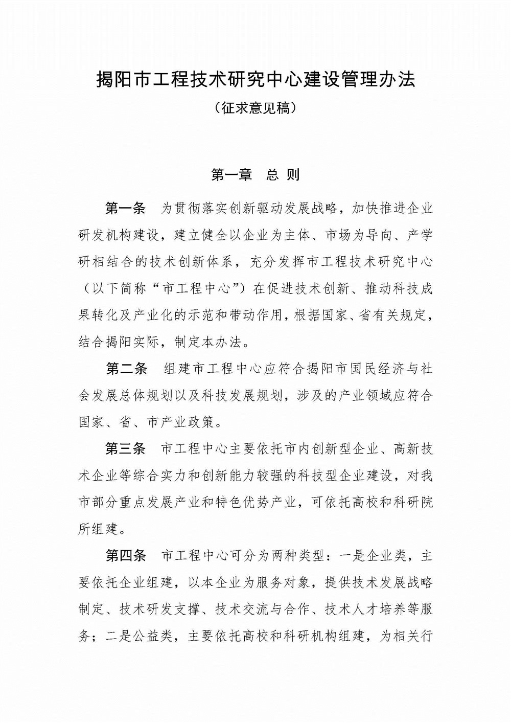 各县(市、区)人民政府(管委会),市直各有关单位: 为深入贯彻落实广东省科技创新大会精神,加快企业研发平台建设,提高企业创新能力,根据省的有关文件要求,结合我市实际,对《揭阳市科学技术局关于市工程技术研究中心建设的管理办法》(揭科字〔2013〕89号)进行修订。现将《揭阳市工程技术研究中心建设管理办法(征求意见稿)》发给你们。请各地、各部门认真研究并提出修改意见,并于7月24日前报送我局科技合作科。 附件:《揭阳市工程技术研究中心建设管理办法(征求意见稿)》