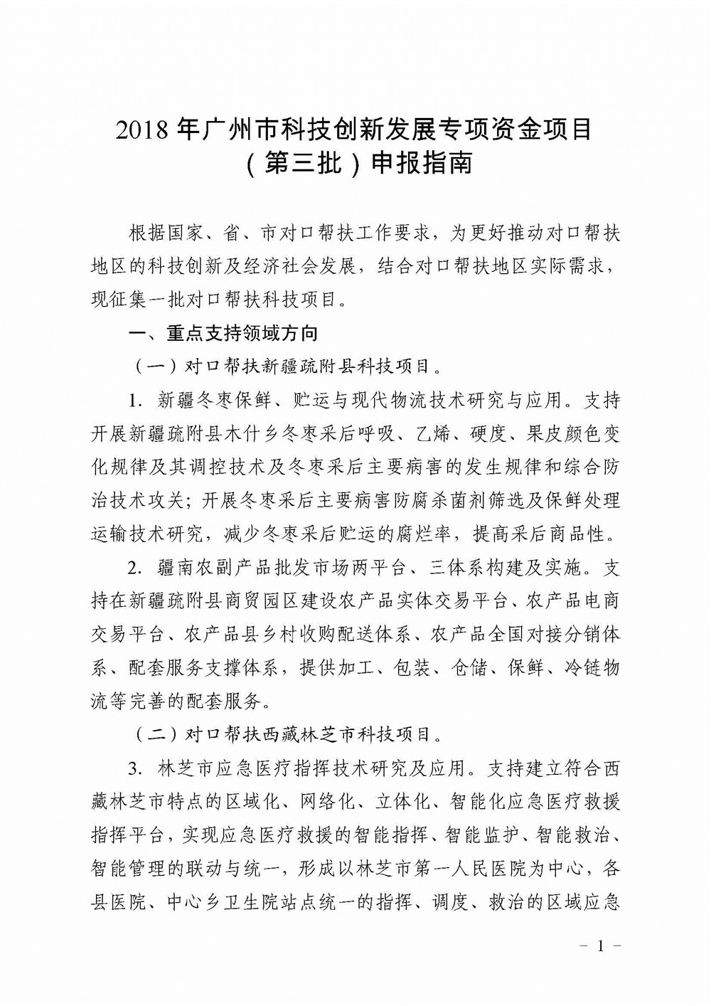 各有关单位: 现启动 2018年广州市科技创新发展专项资金第三批项目(科技帮扶项目)征集工作,请符合条件的申报单位根据指南要求编制项目申报书,在指南规定时间内向指定受理点提交申报材料。