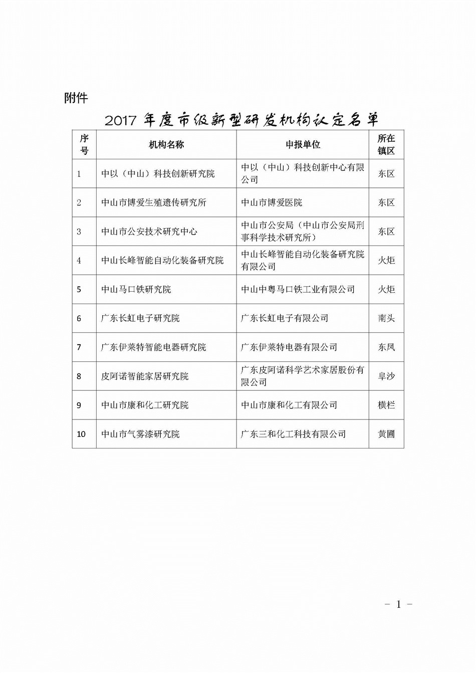 各有关单位: 根据市政府《关于加快新型研发机构发展的若干意见》(中府办〔2015〕19号)以及《中山市新型研发机构认定管理办法》(中山科发〔2015〕98号)。经审核,认定中以(中山)科技创新研究院等10家机构为中山市新型研发机构。 新型研发机构是产学研合作的核心载体,是我省、我市科技创新体系的重要组成部分,是实施创新驱动发展战略的新力量,请各机构积极提升自主创新能力、成果转化能力、行业服务能力,为我市科技创新做出更大的贡献。 附件:2017年度市级新型研发机构认定名单