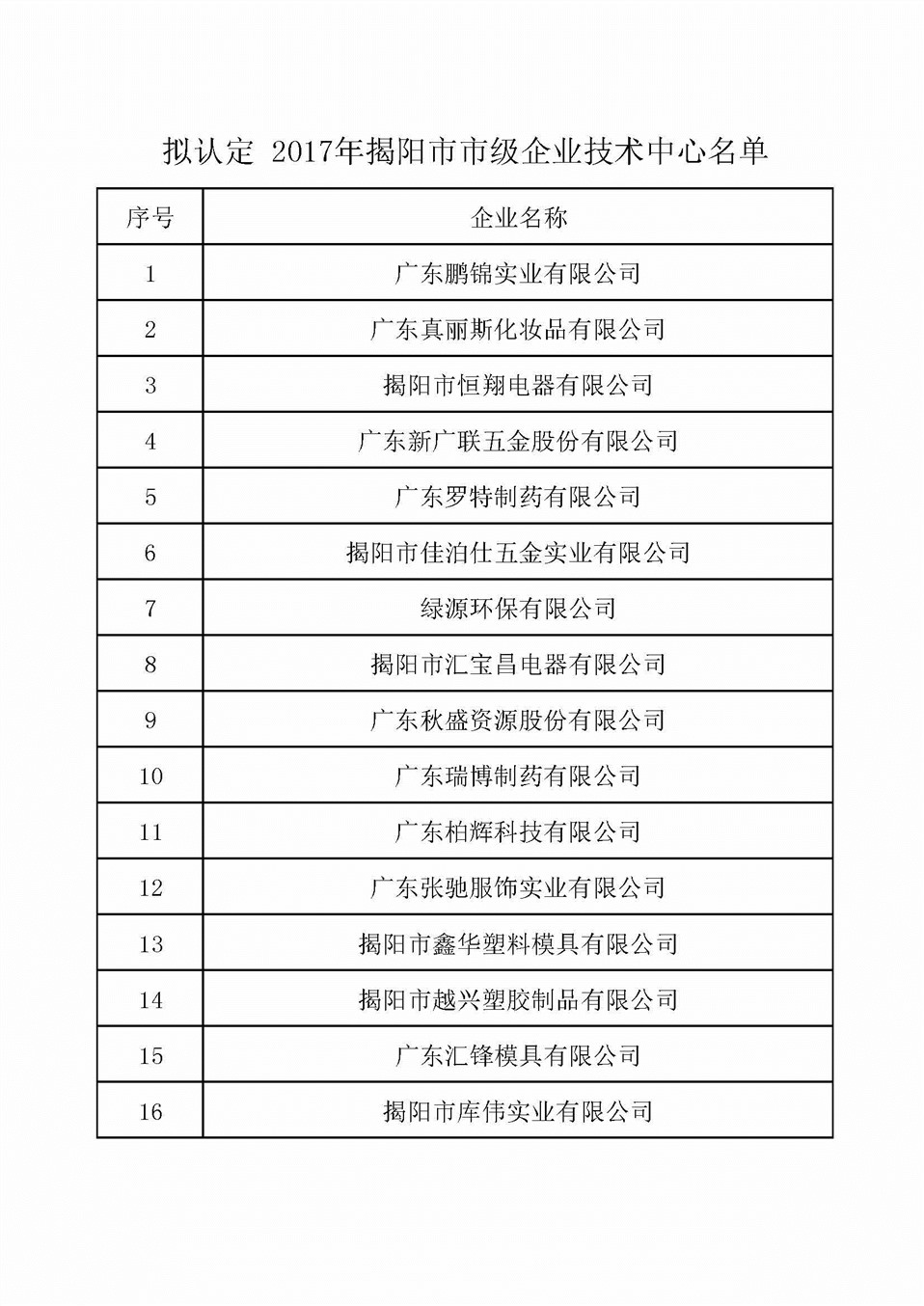 附件:拟认定 2017年揭阳市市级企业技术中心名单