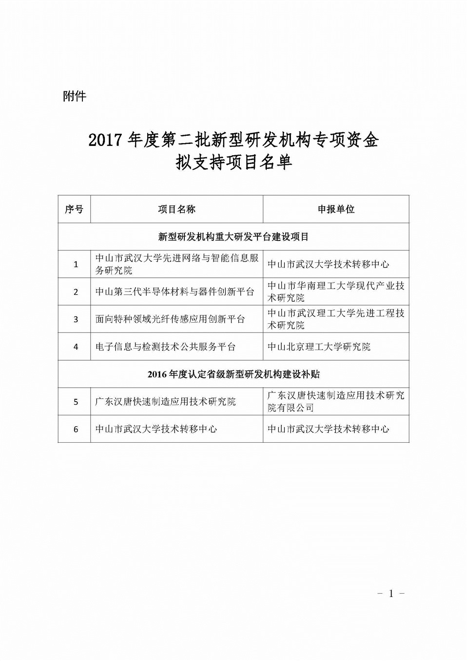 各有关单位: 根据《关于印发中山市新型研发机构专项资金使用办法的通知》(中山科发〔2017〕182号)有关规定,现对2017年度第二批新型研发机构专项资金拟支持项目予以公示。公示期为2017年9月27日至10月8日。公示期内,任何单位和个人对公示项目若有异议,可以书面形式向市科技局提出。所提意义须以书面形式表达,并声明异议内容及依据、提出人的真实姓名及通讯地址、联系方式等,以便联系和处理。 联系人:胡凯亮 电话:0760-88363381 地址:中山市火炬开发区祥兴路6号数贸大厦2栋2楼 邮箱:gdemi@126.com 附件:2017年度第二批新型研发机构专项资金拟支持项目名单.doc
