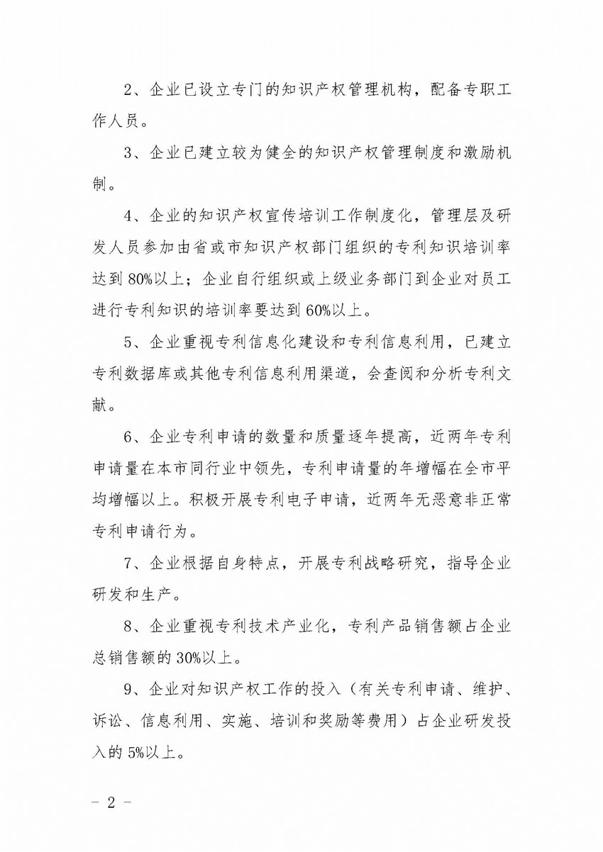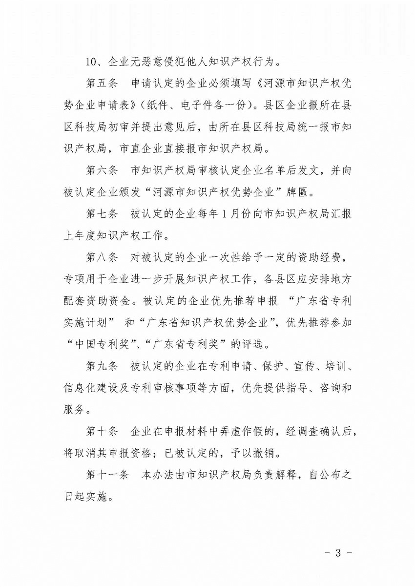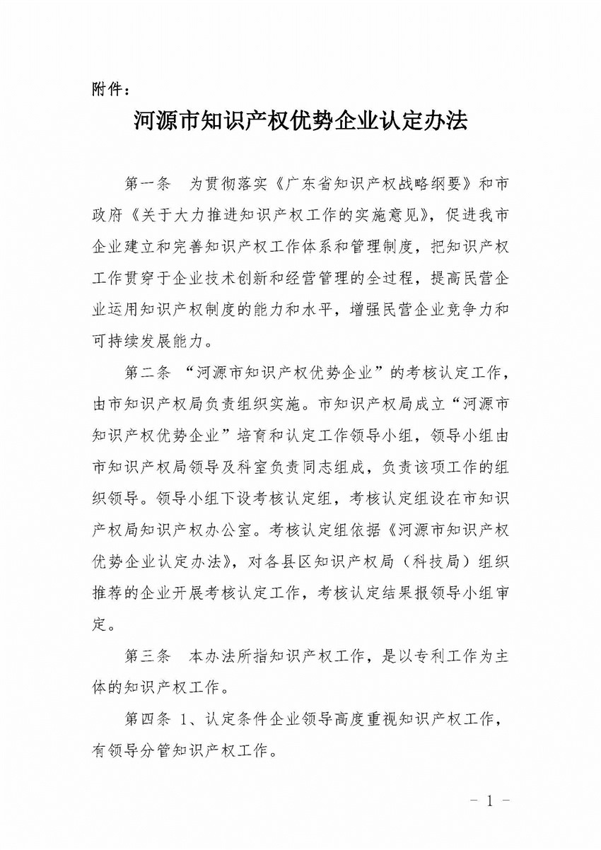 各县(区)知识产权局、财政局,各有关单位: 为提高企业运用知识产权制度谋求创新发展的水平,增强企业核心竞争力,根据《河源市人民政府关于扎实推进知识产权战略推动创新驱动发展的实施意见》(河府〔2016〕16号),决定开展2017年度“河源市知识产权优势企业”认定工作。现将有关事项通知如下: 一、认定范围 计划在市直及各县区重点培育、扶持的企业中遴选,符合条件的其他企业,也可申报。 二、认定条件 参照《河源市知识产权优势企业认定办法》(河知〔2013〕1号,以下简称《办法》)进行。 三、申报程序 (一)注册。首次申报的单位可在市科技业务管理阳光政务平台(网址:http://pro.hysti.gd.cn)注册单位信息,获得单位用户名和密码,同时获得为本单位项目申报人开设用户帐号的权限,项目主持人从单位科研管理人员处获得用户名和密码,填写个人信息后进行申报。已注册的单位继续使用原有帐号进行申报和管理。 (二)申报。各单位和申报人注册后即可在线填写《申报书》通过网络提交申请书及相关材料,并经市(县)部门审核通过后打印书面申报书一式2份(含通过系统上传的所有附件和真实性承诺函原件)送交各县(区)知识产权局,由各县(区)知识产权局审核盖章后统一交市知识产权局。市直企业申报材料直接报送市知识产权局。 四、申报时间 申报单位网上申报及提交截止时间为2017年11月24日下午17:00,县(区)知识产权主管部门网上审核推荐截止时间为2017年12月1日下午17:00。书面申报材料送市知识产权局受理的截止时间为2017年12月8日下午17:00。 五、联系方式 河源市知识产权局:何虹、刘四英