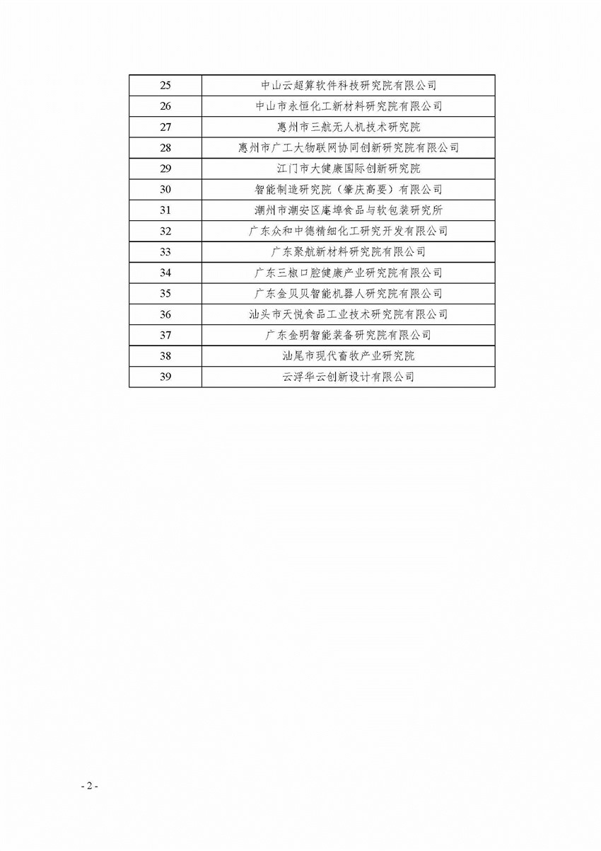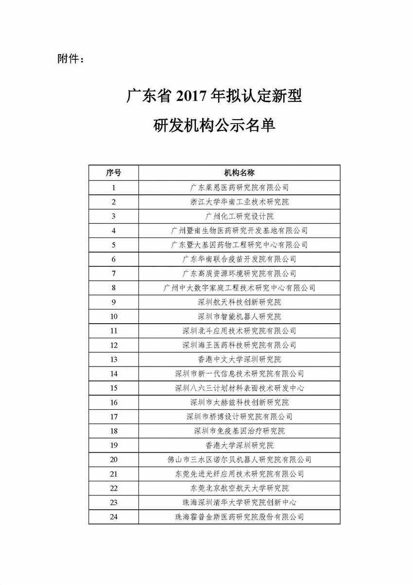 各有关单位: 根据《广东省科学技术厅关于新型研发机构管理的暂行办法》(粤科产学研字〔2017〕69号)《广东省科学技术厅关于申报广东省新型研发机构的通知》(粤科函产学研字〔2017〕1103号)要求,现将拟认定的39家广东省2017年新型研发机构名单予以公示,公示期自11月3~9日,共7天。如有异议,请于公示期内向省科技厅反映。以个人名义反映情况的,请提供真实姓名、联系方式和反映事项的证明材料等;以单位名义反映情况的,请提供真实单位名称(加盖公章)、联系人、联系方式和反映事项的证明材料等。 联系人:陈雪、叶超贤 电 话:020-83163611、83163942 传 真:020-83163927 地 址:广州市连新路171号信息大楼 邮 编:510033 附件:广东省2017年拟认定新型研发机构公示名单