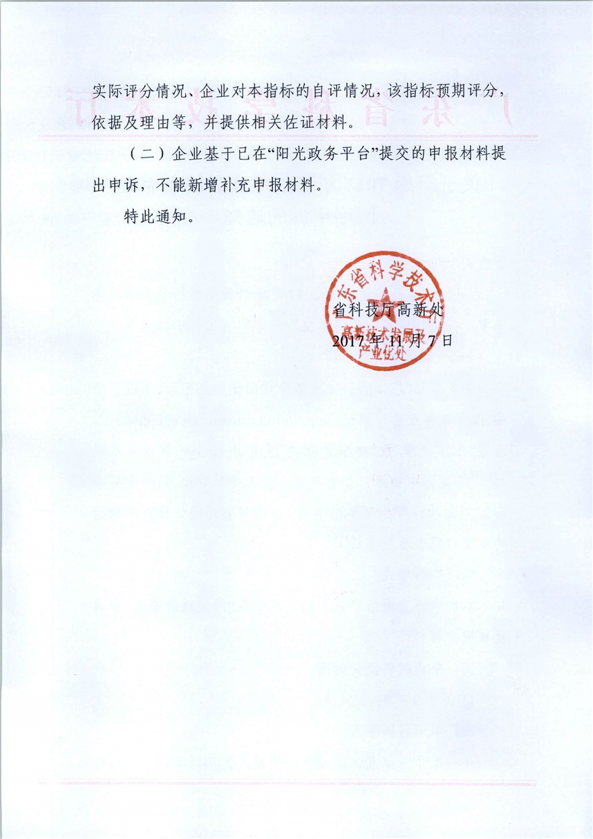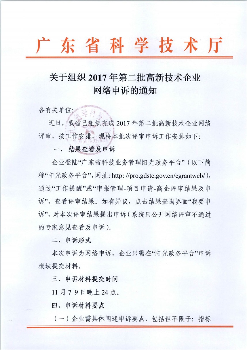 各有关单位: 根据省科技厅的通知,目前已完成2017年第二批高新技术企业网络评审,现将本批次评审申诉工作安排如下: 一、结果查看及申诉 企业登录“广东省科技业务管理阳光政务平台”(http://pro.gdstc.gov.cn/egrantweb/)通过“工作提醒”或“申诉管理—项目申请—高企评审结果及申诉”,查看评审结果。如有异议,点击结果查询界面“我要申诉”,对本次评审结果提出申诉(系统只公开网络评审不通过的专家意见查看及申诉)。 二、申诉形式 本次申诉为网络申诉,企业只需在“阳光政务平台”申诉模块提交材料。 三、申诉材料提交时间 系统提交时间为11月7日—9日晚上24点,同时请相关单位于11月8日下午17:30前将申诉材料PDF版发至邮箱zssgxk@126.com(邮件里请留下联系方式)。 四、申诉材料及要求 企业需具体阐述申诉要点,包括但不限于:指标实际评分情况、企业对本指标的自评情况,该指标预期评分、依据及理由等,并提供相关佐证材料。 企业只能基于已在“阳光政务平台”提交的申报材料提出申诉,不能新增补充申报材料。 联系人:刘智勇、梁茵 联系电话:88303920