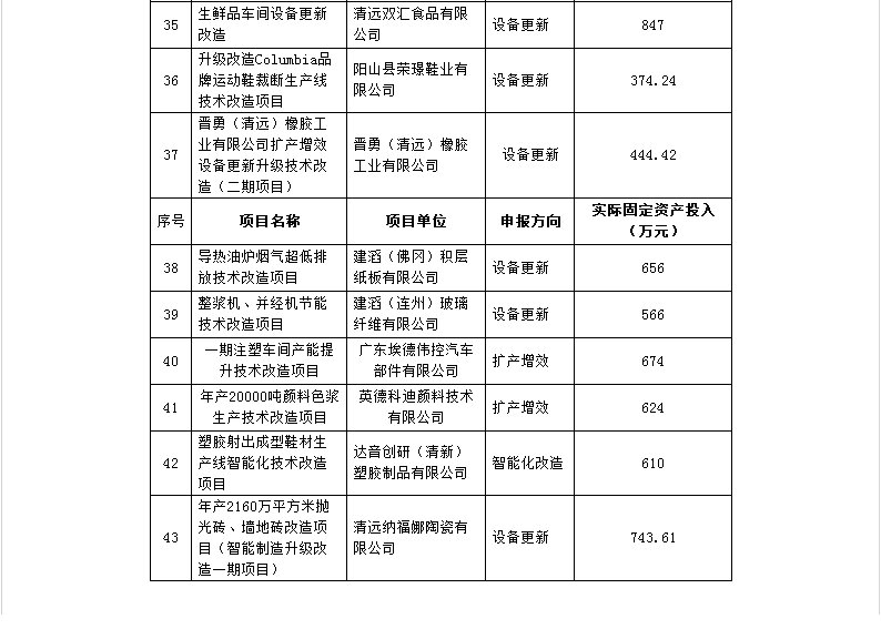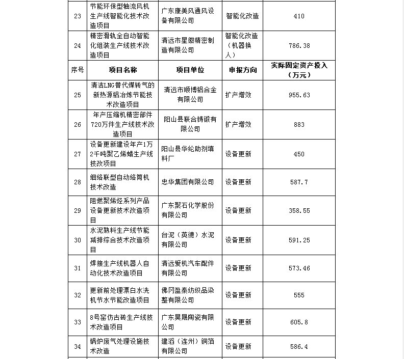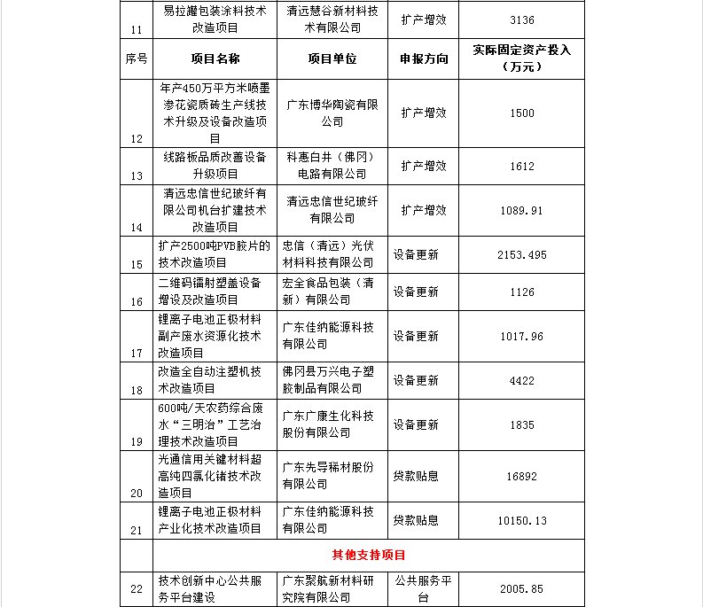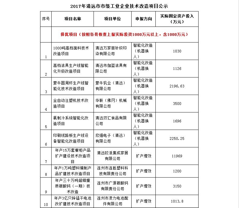 为推动全市工业企业新一轮技术改造,加快产业转型升级,促进经济持续健康发展,根据《关于组织申报2017年清远市市级工业企业技术改造专项资金的通知》(清经信〔2017〕291号)、《清远市扶持工业企业稳增长专项资金管理暂行办法》(清经信〔2015〕266号)文件要求,经各县(市、区)组织部门组织项目申报、推荐和对项目实际固定资产投入核算,以及市经济和信息化局联合市财政局组织了专家评审等,经专家评审,有43个项目通过评审,通过的项目最终以各地验收、局党组会议研究和市政府审定为准。 现将2017年市级支持工业企业技术改造项目进行公示,公示期自2017年11月28至12月4日,共七天。对公示内容如有异议,请在公示期内向市经济和信息化局(技术进步与质量科)和市财政局(工贸发展科)反映。以个人名义反映情况的,请提供真实姓名、联系方式和反映事项证明材料等;以单位名义反映情况的,请提供真实单位名称(加盖公章)、联系人、联系方式和反映事项证明材料等。 附件:2017年清远市市级工业企业技术改造项目公示 市经济和信息化局联系人:杨洁仪;联系电话:0763-3371610;市财政局联系人:邓 琨;联系电话:0763-3877295