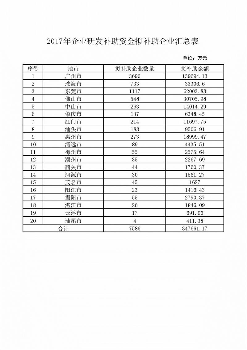 根据《关于激励企业研究开发财政补助试行方案》(粤财工〔2015〕59号)、《广东省省级企业研究开发财政补助资金管理办法(试行)》(粤财工〔2015〕246号)和《广东省企业研究开发省级财政补助政策操作指引(试行)》(粤科政字〔2015〕164号)有关规定,现将2017年企业研究开发补助资金拟支持项目予以公示,公示期为2017年12月7日- 12月13日,共7天。任何单位和个人如对公示内容持有异议,请在公示期内以书面形式向省科技厅、财政厅反映。反映公示名单的情况和问题应坚持实事求是原则,以个人名义反映情况的,请提供真实姓名、联系方式和反映事项证明材料等;以单位名义反映情况的,请提供单位真实名称(加盖公章)、联系人、联系方式和反映事项证明材料等。对收到的异议,我们将严格按照相关规定处理。 联系人及电话: 省科技厅规划财务处:司圣奇,传真:020-83548567 省财政厅工贸发展处:张馨月,传真:020-83170266 附件:2017年企业研究开发补助资金拟补助企业表(汇总表、明细表)