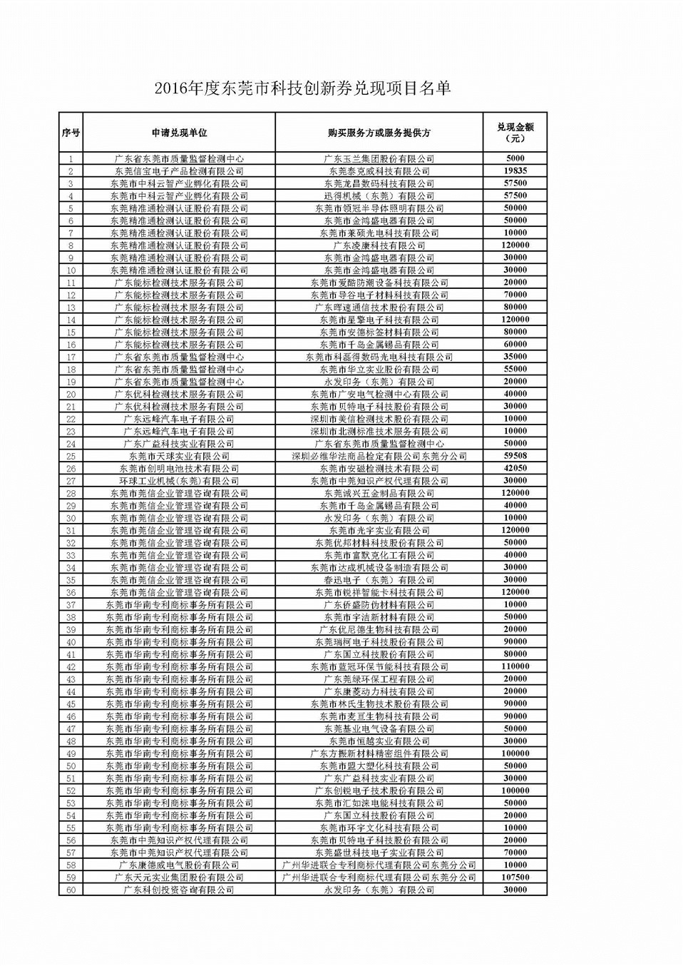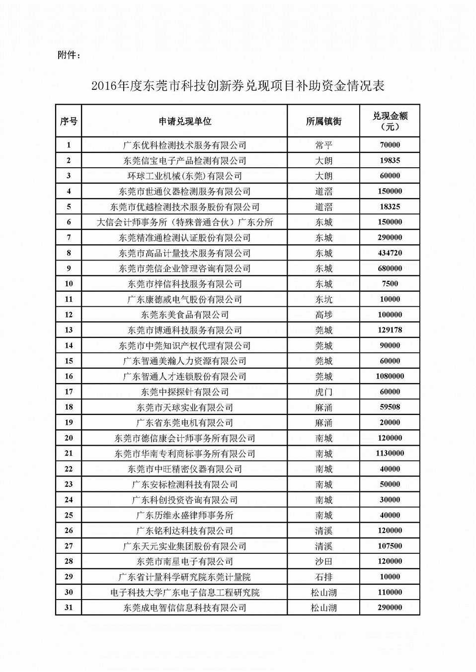 1、2016年度东莞市科技创新券兑现项目补助资金情况表