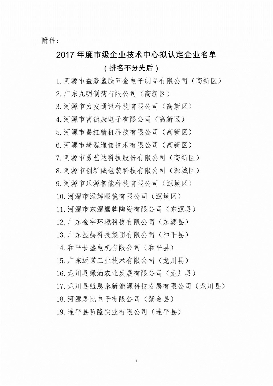 根据《关于印发〈河源市市级企业技术中心管理办法(修订版)〉的通知》(河经信〔2016〕151号)和《河源市经济和信息化局关于组织开展2017年度市级企业技术中心认定工作的通知》(河经信〔2017〕99号)文件规定,市经济和信息化局联合市财政局、市国税局、市地税局、河源海关已完成2017年度河源市市级企业技术中心认定申报、专家评审和现场抽查等工作,现对拟认定2017年度河源市市级企业技术中心的单位予以公示。公示时间为2017年12月21日~2017年12月28日。任何单位或个人如对拟认定单位有异议,可于公示期内以书面形式向市经济和信息化局提出。异议应当签署真实姓名或加盖单位公章,并注明联系方式,否则不予受理。 附:2017年度河源市市级企业技术中心拟认定名单