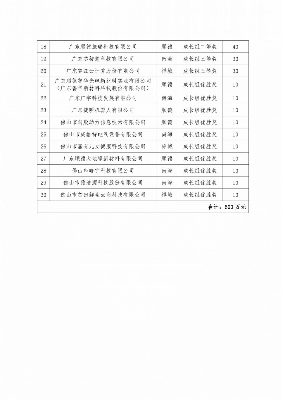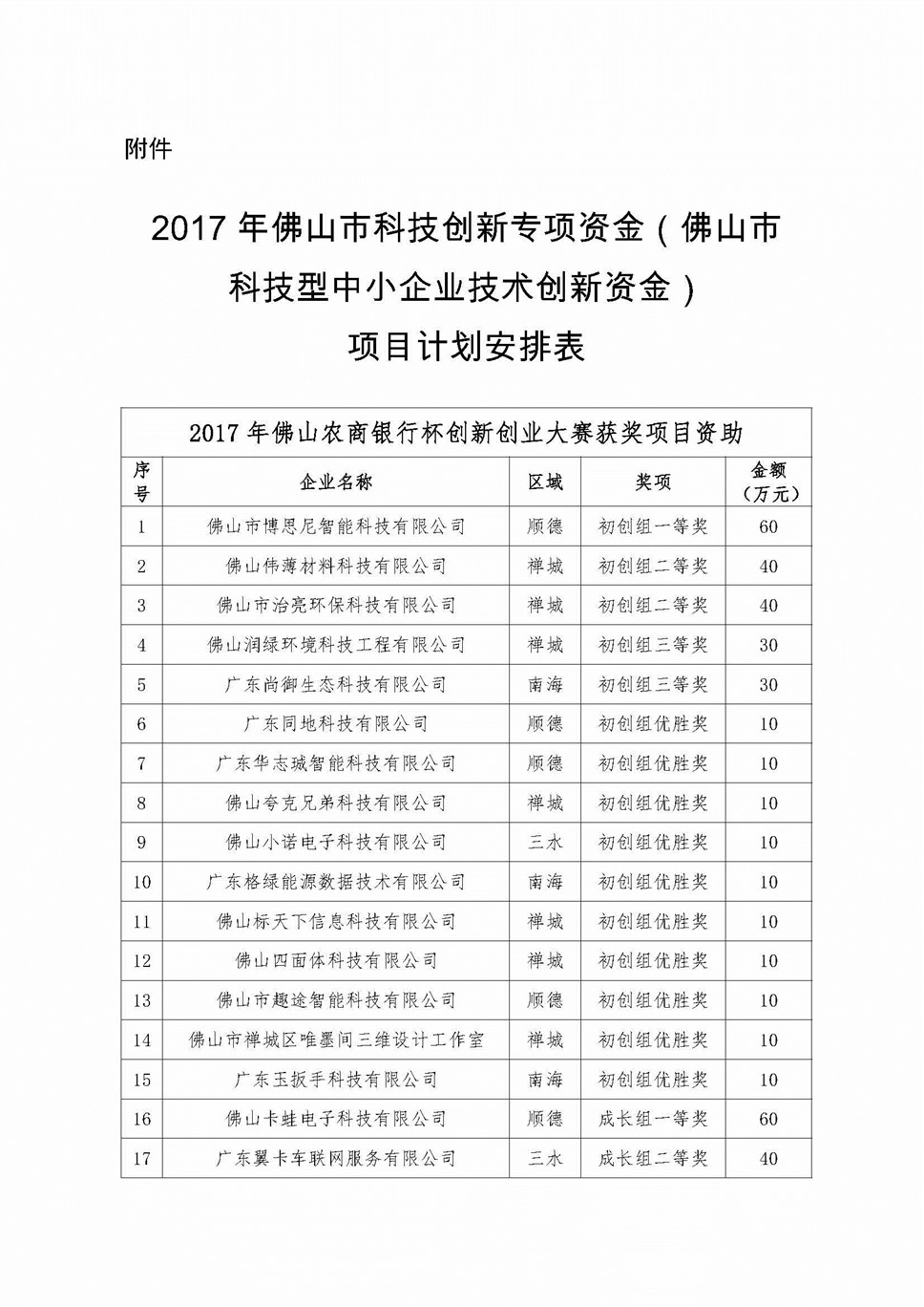 各区经济和科技促进局,各有关单位: 2017年“佛山农商银行杯”创新创业大赛获奖项目已经公示无异议,经市政府批准,安排2017年佛山市科技创新专项资金(佛山市科技型中小企业技术创新资金)对大赛获奖企业进行资助。本次下达科技计划项目30项,市级财政专项资金600万元,请各单位严格按照管理文件规定,加强对资金的监督管理,专款专用。 附件:2017年佛山市科技创新专项资金(佛山市科技型中小企业技术创新资金)项目计划安排表