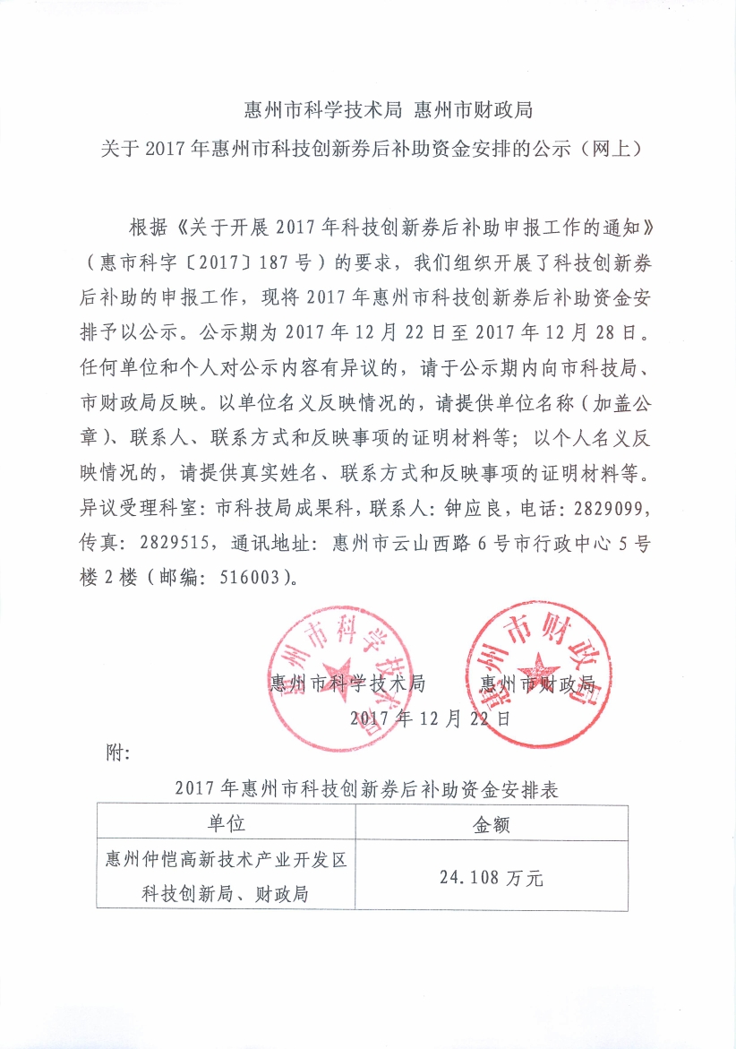 关于2017年惠州市科技创新卷后补助资金安排的公示