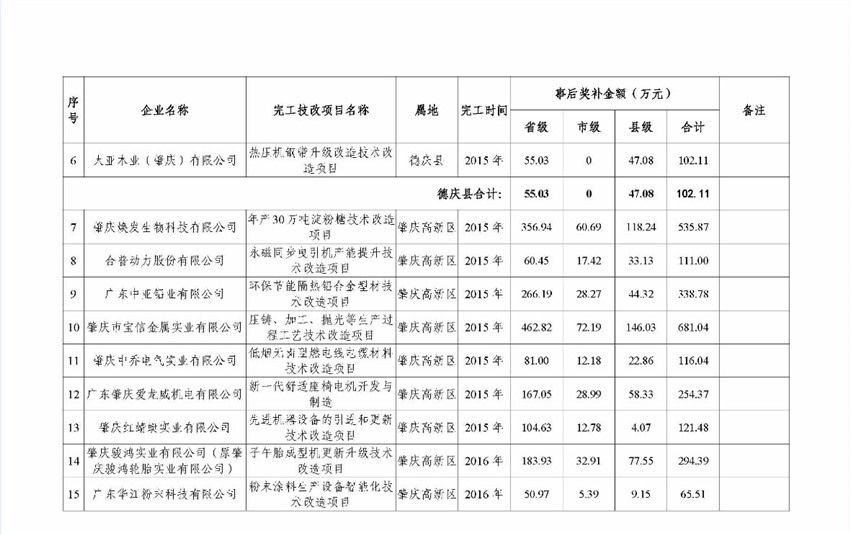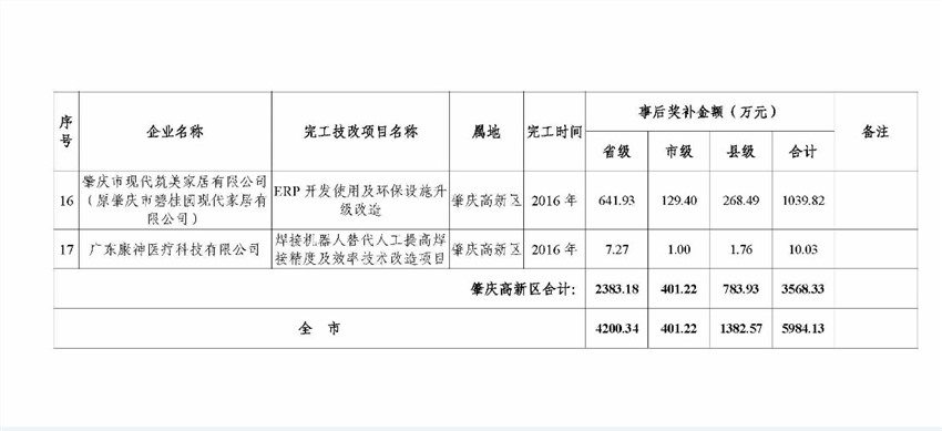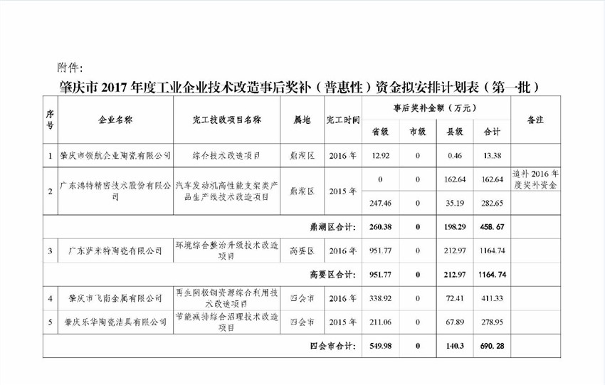 根据《广东省工业企业技术改造事后奖补实施细则》(粤经信技改〔2015〕439号)、《广东省工业企业技术改造事后奖补工作指引》(粤经信技改〔2015〕490号)、《肇庆市工业企业技术改造事后奖补实施细则》(肇经信技术〔2017〕1号)的有关规定,市经济信息化局会同市财政局、市国税局、市地税局、市统计局组织了2017年度工业企业技术改造事后奖补(普惠性)资金的申报工作。经市、县(市、区)两级主管部门核算和复核,现将肇庆市2017年度工业企业技术改造事后奖补(普惠性)资金拟安排计划(第一批)予以公示。公示期自2018年1月22日至2018年1月27日,共6日。对公示内容如有异议,请在公示期内向市经济信息化局(技术与质量科)和市财政局(工贸发展科)反映。以个人名义反映情况的,请提供真实姓名、联系方式和反映事项证明材料等;以单位名义反映情况的,请提供真实单位名称(加盖公章)、联系人、联系方式和反映事项证明材料等。 市经济信息化局联系人:黄健明;联系电话:2237449。 市财政局联系人:赵星华;联系电话:2272132。 附件:肇庆市2017年度工业企业技术改造事后奖补(普惠性)资金拟安排计划表(第一批) 本通知及附件均可在肇庆市经济和信息化局网站查阅及下载: http://jxj.zhaoqing.gov.cn/jxdt/tzgg/201801/t20180122_587651.html