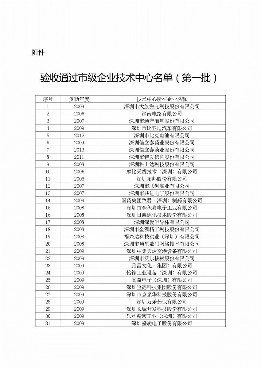 各有关企业: 按照有关规定,经我委组织审计验收,深圳市大族激光科技股份有限公司等65家单位申请验收的深圳市企业技术中心建设资助项目验收通过(见附件)。 特此通知。 附件:验收通过市级企业技术中心名单(第一批)
