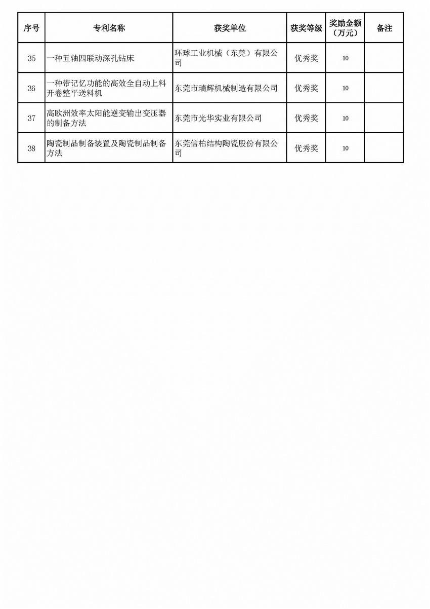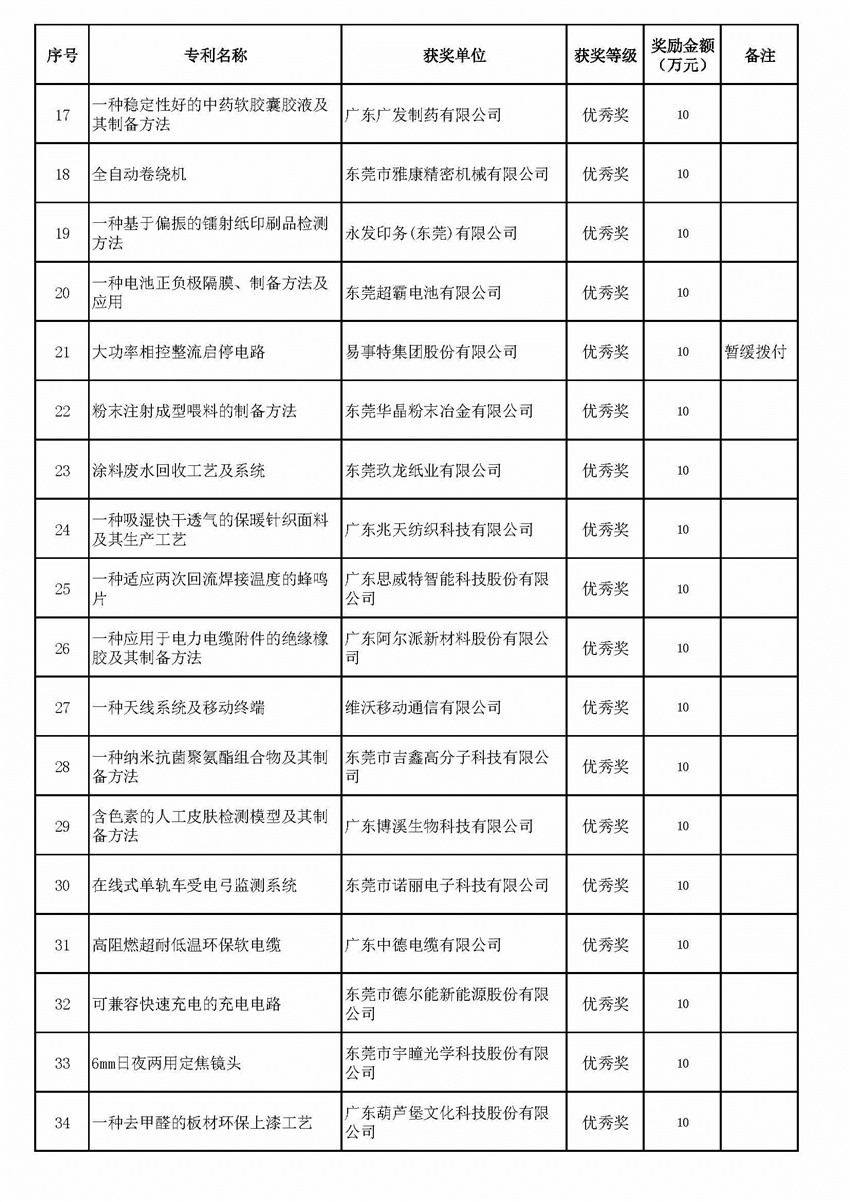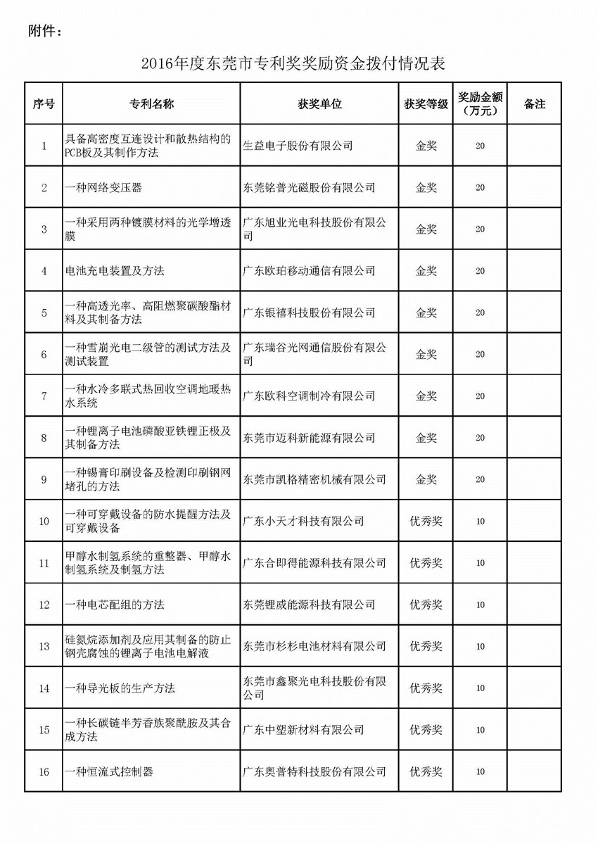 各有关单位: 经市政府同意,“具备高密度互连设计和散热结构的PCB板及其制作方法”等9项专利技术获得2016年度东莞市专利金奖,“一种可穿戴设备的防水提醒方法及可穿戴设备”等29项专利技术获得2016年度东莞市专利优秀奖。其中专利金奖每项奖励20万元,专利优秀奖每项奖励10万元,奖励资金合计470万元。 现将奖金拨付给你们(详见附件),其中易事特集团股份有限公司的奖励资金10万元暂缓拨付。请各有关单位在收到奖励资金后,按照各自适用的会计制度或会计准则做好会计核算和账目处理。执行中遇有问题,请及时向市知识产权局反映。 联系人:知识产权促进科廖彦昭; 联系电话:22831346 特此通知 附件:2016年度东莞市专利奖奖励资金拨付情况表