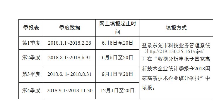 松山湖科创局、各镇(街)科技主管部门、各高新技术企业: 为加强全市科技发展形势分析,及时掌握我市高新技术企业的运行情况,现组织开展2018年高新技术企业季报调查工作,并将有关事项通知如下: 一、调查对象 2015~2017年经认定的国家高新技术企业。 二、调查内容 主要调查企业的生产经营及技术创新情况。全部调查数据仅限我局内部使用,不对外公开。 三、填报时间及方式 每季度填报一次,采用网上填报方式,不用递交书面材料。具体填报时间及方式如下: