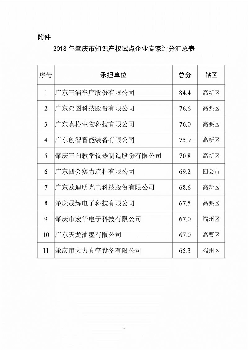 各县(市、区)、肇庆高新区知识产权局,市直有关企业: 根据《关于组织申报2018年度市级知识产权试点企业的通知》(肇知〔2018〕5号),我局组织专家,对申报2018年度市级知识产权试点企业进行了评审,现将分数予以公示,公示时间为:2018年6月14日-2018年6月21日。如有异议,请以实名通过书面向市科技局办公室或知识产权管理科反映。 联系方式:2899801(办公室) 2899818(知识产权管理科) 地 址:肇庆市端州六路芙蓉西二街市科技中心大楼