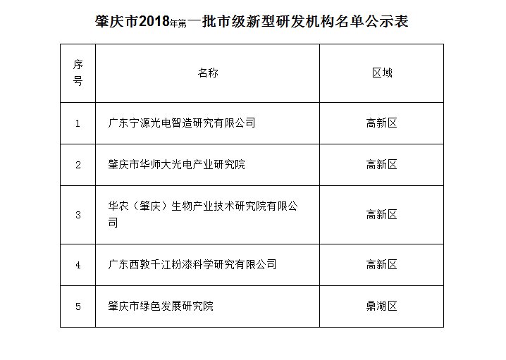 各有关单位: 根据《肇庆市新型研发机构认定和扶持暂行办法》(肇府规〔2017〕23号)和《关于组织申报2018年度市级新型研发机构的通知》要求,现将拟认定的5家2018年第一批市级新型研发机构名单予以公示,公示期自6月22~28日,共7天。如有异议,请于公示期内向市科技局反映。以个人名义反映情况的,请提供真实姓名、联系方式和反映事项的证明材料等;以单位名义反映情况的,请提供真实单位名称(加盖公章)、联系人、联系方式和反映事项的证明材料等。
