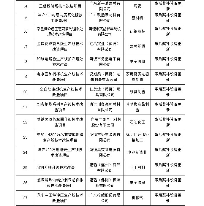 根据省经信委《关于下达2018年促进经济发展专项(企业技术改造用途)资金项目计划的通知》(粤经信技改函〔2018〕36号)、《关于组织2018年省级工业和信息化专项资金(支持企业技术改造)项目入选项目库的通知》(粤经信技改函〔2017〕76号)、《关于组织申报2018年省级工业和信息化专项资金支持企业技术中心和智能制造专题项目库的通知》(粤经信办函〔2017〕391号)文件精神,要求各地市组织企业开展申报,并组织专家对申报项目进行评审。 经各县(市、区)经信部门初审及推荐、专家评审、党组集体讨论等环节,有31个项目通过企业技术改造用途资金专题,其中:有30个项目奖补方式为事后奖补设备更新,有1个项目奖补方式为贷款贴息;有1个项目通过企业技术中心专题;有1个项目通过智能制造专题。现将2018年省级促进经济发展专项(企业技术改造用途)资金项目专题、企业技术中心专题、智能制造专题项目进行公示。公示期自2018年7月4日至7月10日,共七天。对公示内容如有异议,请在公示期内向市经济和信息化局(技术进步与质量科)和市财政局(工贸发展科)反映。以个人名义反映情况的,请提供真实姓名、联系方式和反映事项证明材料等;以单位名义反映情况的,请提供真实单位名称(加盖公章)、联系人、联系方式和反映事项证明材料等。 附件: 1、2018年广东省省级工业和信息化专项资金(支持企业技术改造)项目计划表