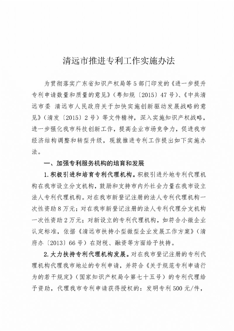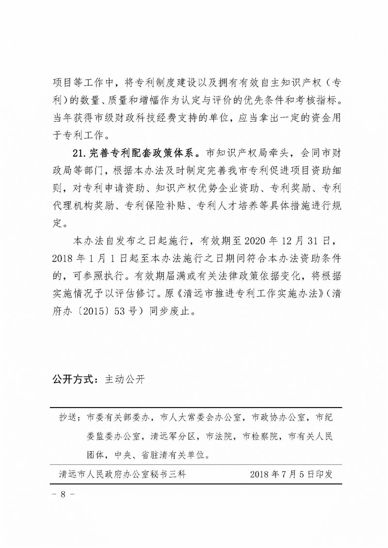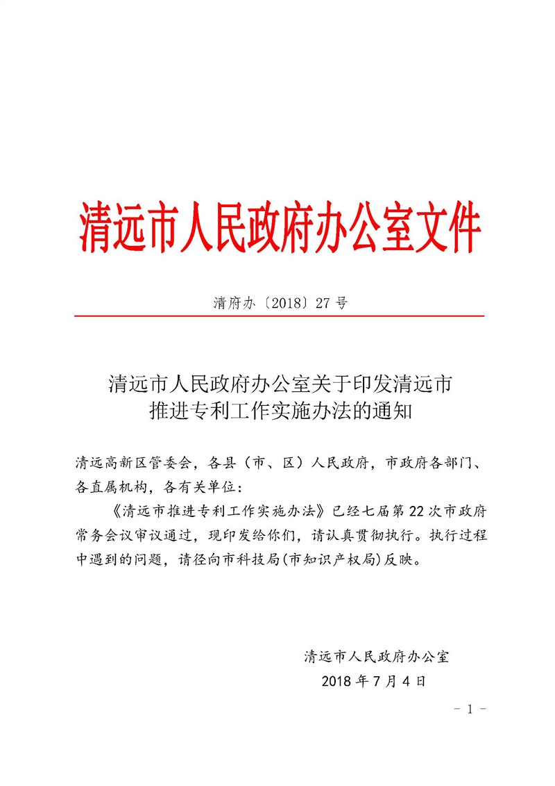 清远市人民政府办公室关于印发清远市推进专利工作实施办法的通知(清府办〔2018〕27号)