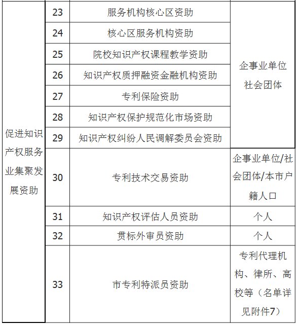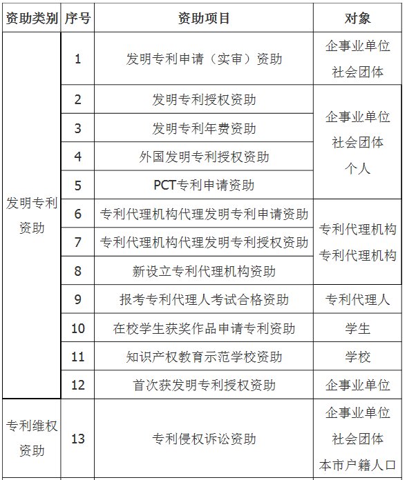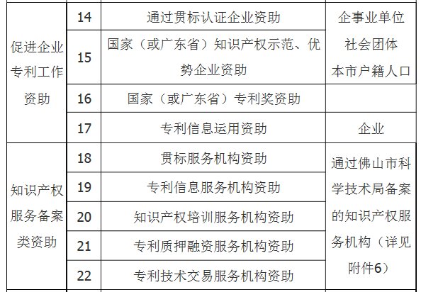 市知识产权保护中心,各区经济和科技促进局,各有关单位: 根据《佛山市人民政府办公室关于印发佛山市专利资助办法补充规定的通知》(佛府办〔2014〕44号)和《佛山市人民政府办公室关于印发佛山市促进知识产权服务业集聚发展资助试行办法的通知》(佛府办〔2016〕12号),现就开展2017年度专利资助申报工作有关事项通知如下: 一、资助类别和对象 本次资助包括发明专利资助、专利维权资助、促进企业专利工作资助、知识产权服务备案类资助、促进知识产权服务业集聚发展资助共五大类资助,详见下表: