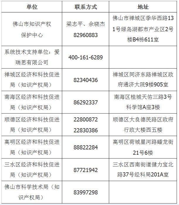 六、投诉与监督 佛山市纪委监委派驻市经济和信息化局纪检监察组(综合派驻)负责“佛山市专利资助工作”全程监督。对申报、审核过程及评审结果可信访举报投诉,投诉电话:83993576,投诉邮箱:huanghaiying@fszfw.gov.cn。 附件: 1.《佛山市人民政府办公室关于印发佛山市专利资助办法补充规定的通知》(佛府办〔2014〕44号) 2.《佛山市人民政府办公室关于印发佛山市促进知识产权服务业集聚发展资助试行办法的通知》(佛府办〔2016〕12号) 3.佛山市专利资助申报指南 4.专利资助附件材料样本 5.2017年国家、省专利奖及示范优势企业名单 6.2015-2018年度佛山市知识产权服务机构备案名单 7.通过佛山市第一批专利特派员年度考评名单 8.2017年度佛山市专利资助资金预分配承诺函(模板) 本通知及附件均可在佛山市科学技术局网站查阅及下载: http://www.fskw.gov.cn/tzgg/201807/t20180719_7160965.html