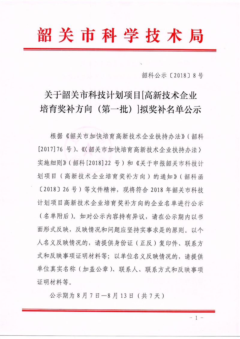 相关附件: 高新技术企业培育拟奖补方向附件.pdf 本通知及附件均可在韶关市科学技术局网站查阅及下载: http://www.sgkj.gov.cn/xwzx/tzgg/