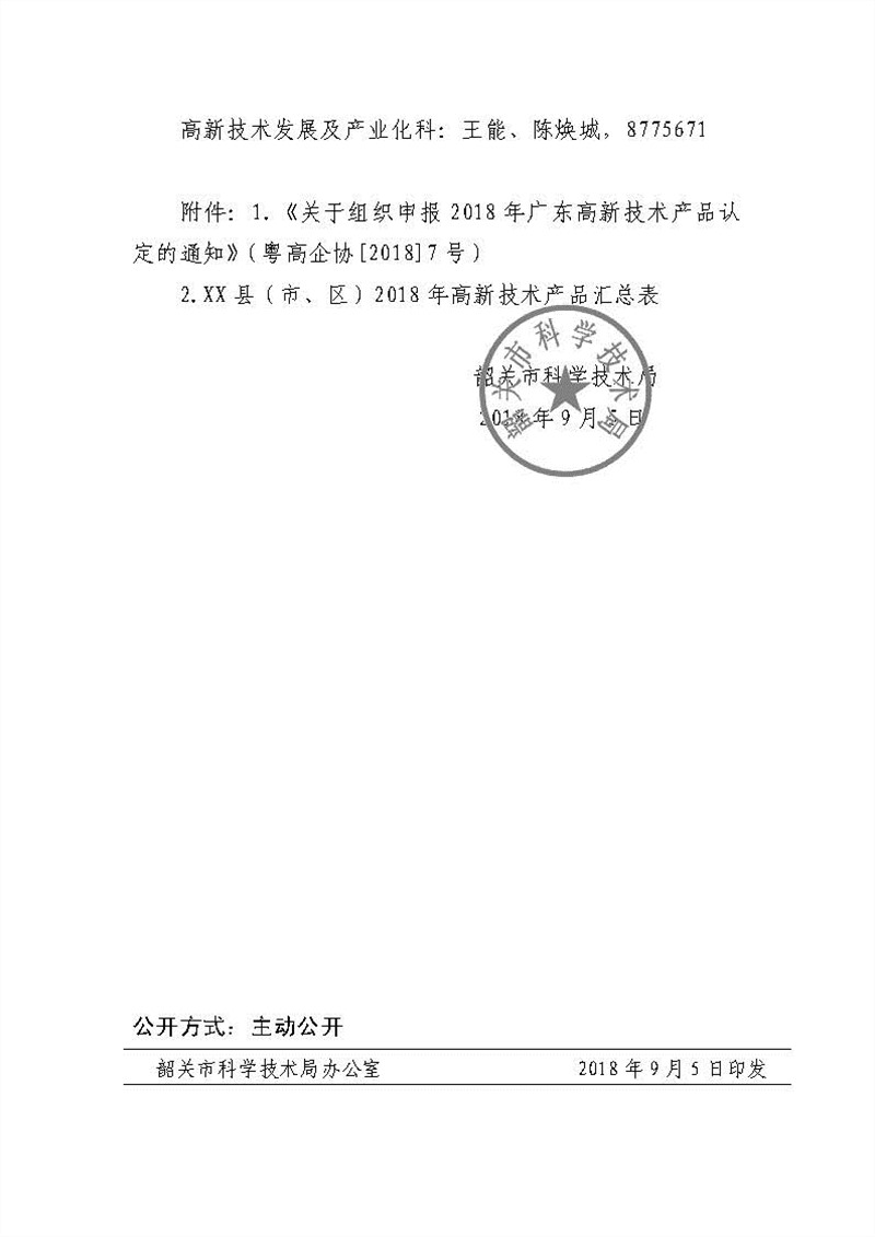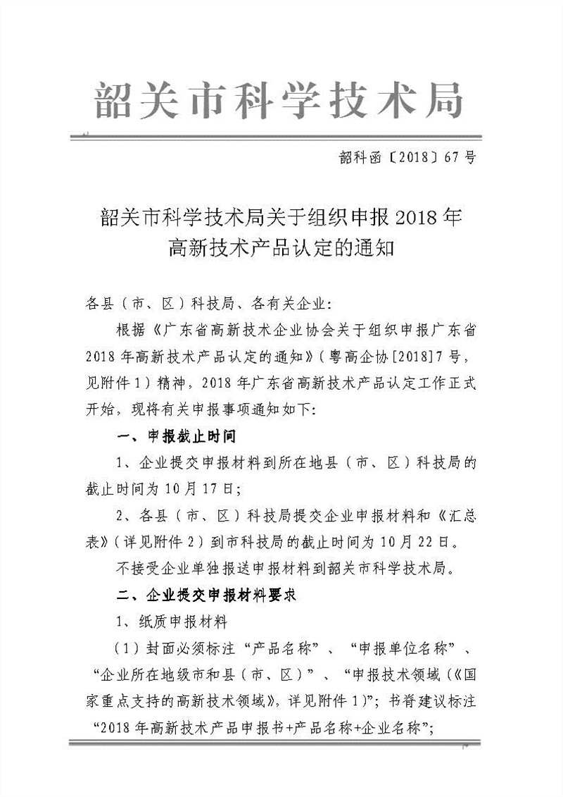 韶关市科学技术局关于组织申报2018年高新技术产品认定的通知