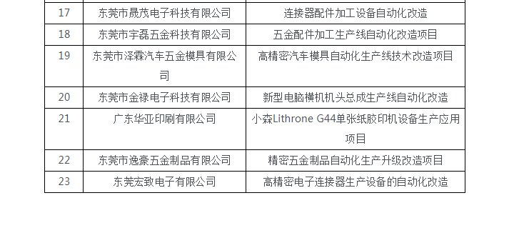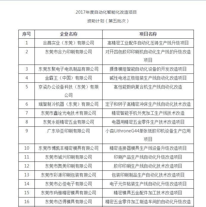 根据《<东莞市经济和信息化专项资金管理办法>及智能制造、绿色制造、服务型制造专题项目实施细则》(东府办〔2017〕158号)等规定,我局组织开展了2017年度自动化智能化改造项目申报工作。经过项目网上申报、材料初审、专家验收认定、第三方现场审计等工作流程,现将《2017年度自动化智能化改造项目资助计划(第五批次)》(详见附件)予以公示。 公示期间,如有异议,请以书面方式向市经济和信息化局技术进步与质量科反映。以个人名义反映情况的,请提供真实姓名、联系方式、反映的具体事项以及相关的证明材料;以单位名义反映情况的,请提供单位真实名称(加盖公章)、联系人、联系方式、反映的具体事项以及相关的证明材料。 公示期间:2018年9月25日至2018年10月1日 受理单位:市经济和信息化局技术进步与质量科 地址:南城区鸿福西路68号塞纳嘉园二楼 电话:0769-22222425 传真:0769-22222527 本通知可在东莞市科学技术局网站查阅: http://imdg.gov.cn/dgetb/jxgg/201809/7eec34b269c7423380b3b914d6659ef0.shtml