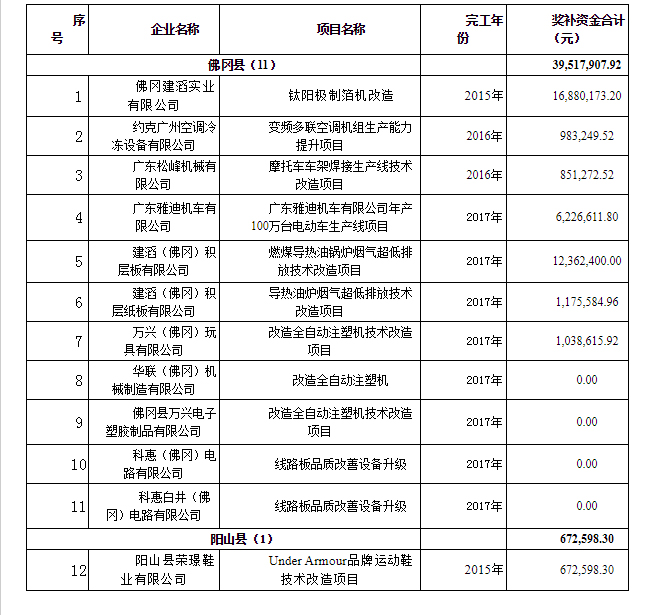 在2018年清远市工业企业技术改造项目事后奖补(普惠性)资金安排的公示期间,我局收到了佛冈县经信、财政和阳山县经信、财政对部分企业对项目核算的入库税收额有不同意见。鉴于这种情况,我局要求佛冈县主管部门以及阳山县主管部门重新核实并上报相关企业实际入库税收,并要求市税务局进行核实。现将重新核算的佛冈县和阳山县2018年事后奖补(普惠性)资金进行公示,公示期自2018年11月6日至11月12日,共七天。对公示内容如有异议,请在公示期内向市经济和信息化局(技术进步与质量科)反映。以个人名义反映情况的,请提供真实姓名、联系方式和反映事项证明材料等;以单位名义反映情况的,请提供真实单位名称(加盖公章)、联系人、联系方式和反映事项证明材料等。 市经济和信息化局联系人:黄玲,联系电话:0763-3371610 附件:2018年佛冈县和阳山县工业企业技术改造项目事后奖补(普惠性)资金安排计划表