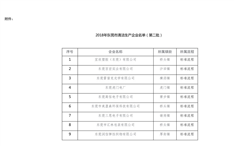 根据《中华人民共和国清洁生产促进法》和《广东省经济和信息化委 广东省环境保护厅关于印发清洁生产审核及验收工作流程的通知》等有关规定,市工信局委托第三方机构对本局牵头的企业开展了清洁生产审核验收工作。经企业申请、形式审查和现场评估验收等程序,现认定宜欣塑胶(东莞)有限公司等138家企业(详见附件)为2018年东莞市清洁生产企业(第二批),并予以公示。公示期自2019年1月16日至1月22日,共7日。 对公示内容如有异议的,请在公示期内向市工业和信息化局节能与循环经济科反映。以个人名义反映情况的,请提供真实姓名、联系方式和反映事项证明材料等;以单位名义反映情况的,请提供真实单位名称(加盖公章)、联系人、联系方式和反映事项证明材料等。联系电话:0769-26988212。 附件:2018年东莞市清洁生产企业名单(第二批)